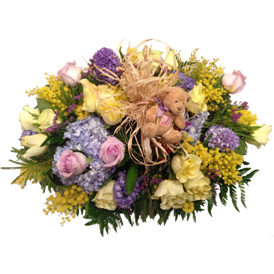 Descripcion: Centro de flores en cesta, ideal para felicitar un nacimiento, elaborado con gran cantidad de flores olorosas y variadas, e incluye un osito de peluche. Precio final (Impuestos y gastos de envio en la ciudad de Cartagena y Periferia incluidos en el precio). Se lo podemos entregar hoy o el dia que usted elija. Si desea que lo enviemos a cualquier otro lugar de la provincia de Murcia, consultenos por telefono el coste de dicho envio
