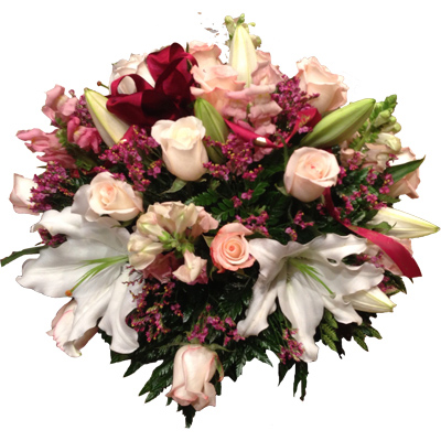 Descripcion: Bonito centro redondo con rosas, flor de olor y flores variadas. Precio final (Impuestos y gastos de envio en la ciudad de Cartagena y Periferia incluidos en el precio). Se lo podemos entregar hoy o el dia que usted elija. Si desea que lo enviemos a cualquier otro lugar de la provincia de Murcia, consultenos por telefono el coste de dicho envio