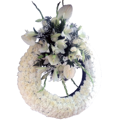 Descripcion: Corona Funeraria realizada con claveles blancos y cabecero formado por Anthurium, Lilium longiflorum, Gladiolo, Margarita, acompañanadas con verdes variados. Precio final (Impuestos y gastos de envio en la ciudad de Cartagena y Periferia incluidos en el precio). Se lo podemos entregar hoy o el dia que usted elija. Si desea que lo enviemos a cualquier otro lugar de la provincia de Murcia, consultenos por telefono el coste de dicho envioGama de precios: 180 € a 180 €